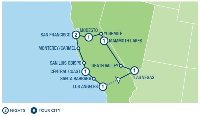Oggi viaggiate verso sud attraverso la valle di Santa Ynez sino a Santa Barbara, dove lungomari punteggiati di palme ondeggianti costeggiano le bianche spiagge. All’arrivo a Los Angeles farete una sosta a Santa Monica, dove termina la famosa Route 66 e potrete godere di un pranzo opzionale sul rinomato pontile o affittare le biciclette per un giro sul lungomare (tour opzionale). Il vostro tour pomeridiano della “Citta’ degli Angeli” continua con bellissime viste di Beverly Hills e Hollywood prima di raggiungere il vostro hotel dove si conclude il tour. Il transferimento di ritorno all’aeroporto e’ incluso.